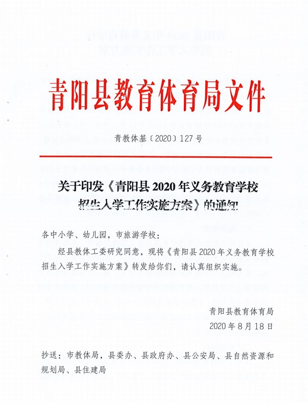 名稱: 關于印發《青陽縣2020年義務教育學校招生入學工作實施方案》的通知 文號: