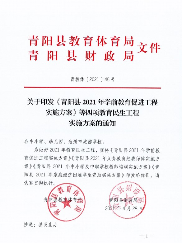 關于印發《青陽縣2021年學前教育促進工程實施方案》等四項教育民生工程實施方案的通知