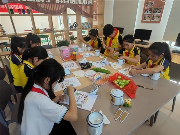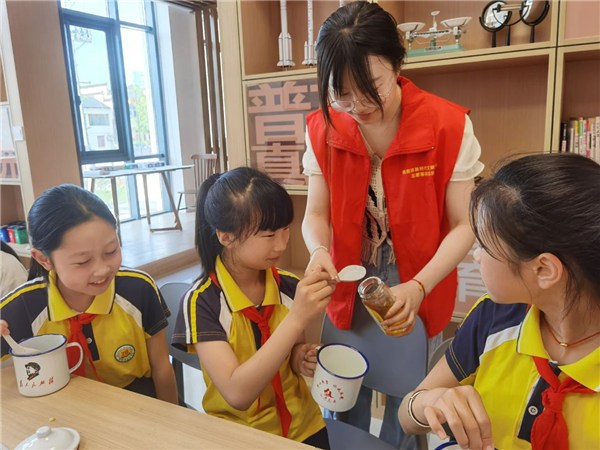 小滿(mǎn)節(jié)氣后,氣溫將進(jìn)一步升高,濕氣逐步加大,人們可以適當(dāng)食用茶、苦瓜等具有清熱解毒功效的苦味食物。因此,活動(dòng)一開(kāi)始,新時(shí)代文明實(shí)踐所工作人員組織孩子們制作苦瓜檸檬水,將切好的苦瓜和檸檬放入杯子中,用勺子搗爛再倒入涼水,清熱降火的苦瓜檸檬水就做好啦!