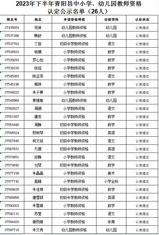 附:2023年下半年青陽縣中小學、幼兒園教師資格認定公示名單