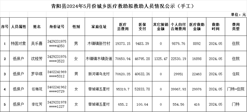 附:青陽縣2024年5月份城鄉醫療救助擬救助人員情況公示