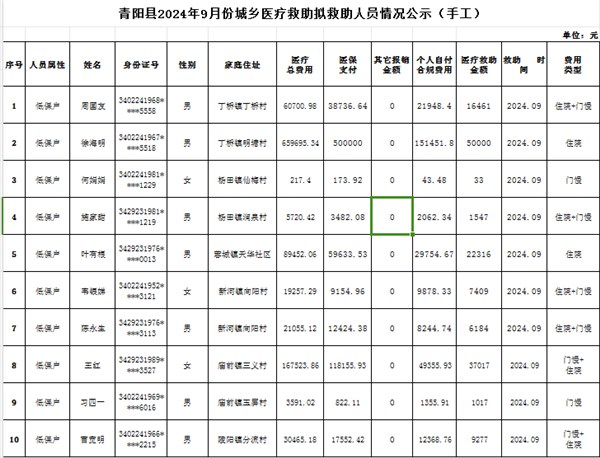 附:青陽縣2024年9月份城鄉醫療救助擬救助人員情況公示
