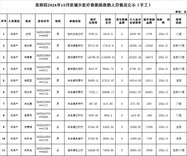 附:青陽縣2024年10月份城鄉醫療救助擬救助人員情況公示