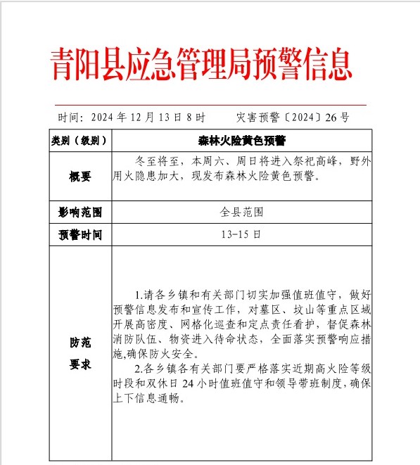 索引號: 1134182003291632G/202412-00012 組配分類: 預警提示信息