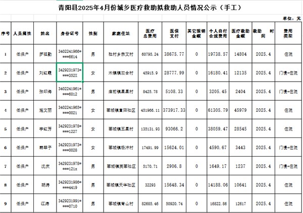 附:青陽縣2025年4月份城鄉醫療救助擬救助人員情況公示