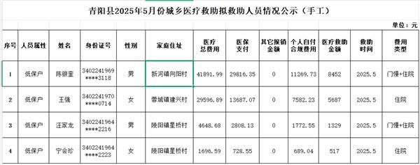 附:青陽縣2025年5月份城鄉醫療救助擬救助人員情況公示