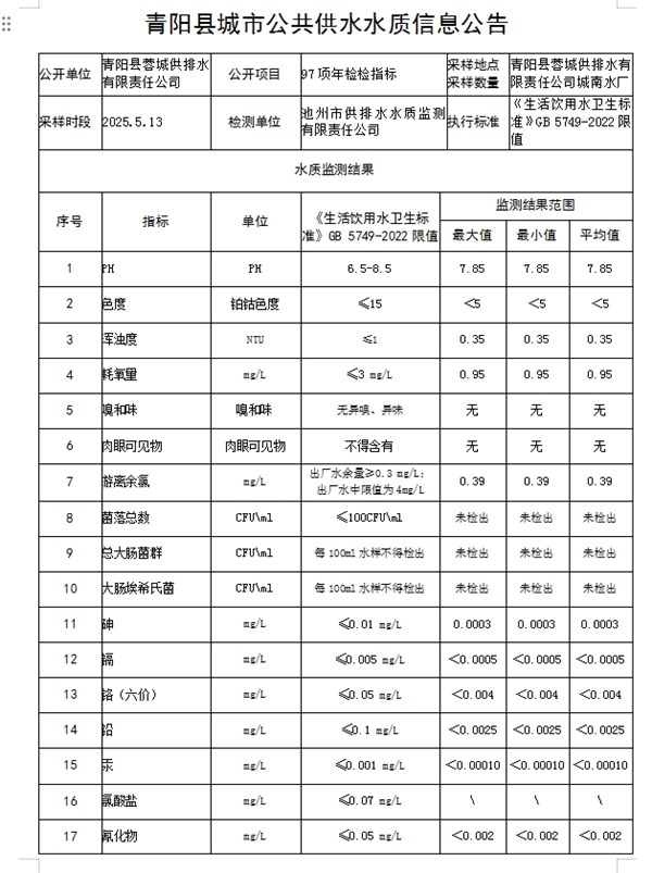 名稱: 城南水廠2025年上半年出廠水“97”項年檢指標公示 文號: