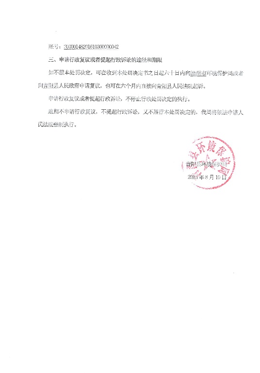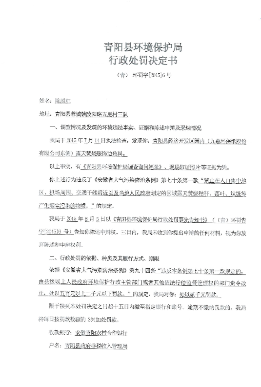 青陽(yáng)縣環(huán)境保護(hù)局行政處罰決定書(shū)