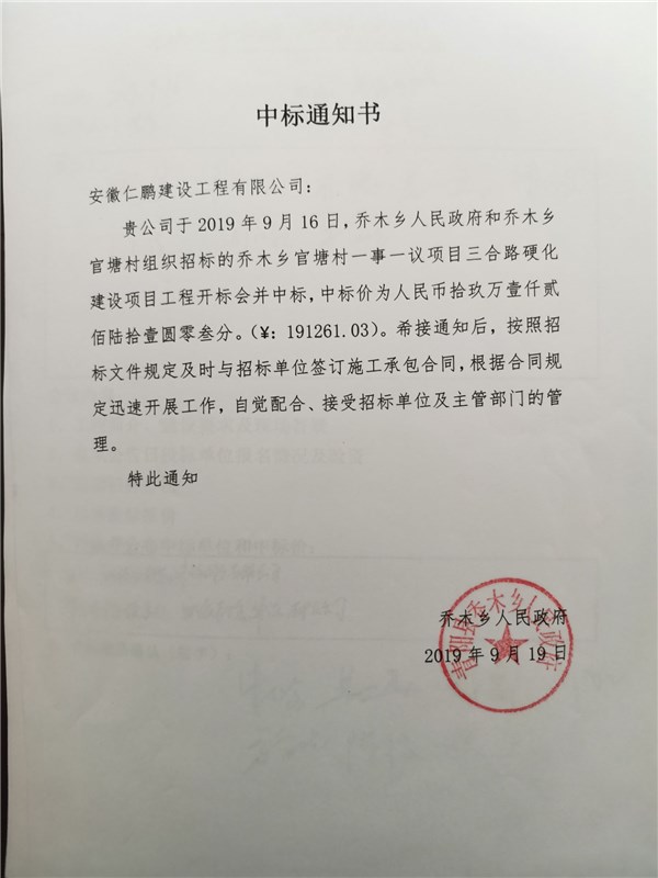 喬木鄉官塘村一事一議項目三合路硬化建設項目中標通知書