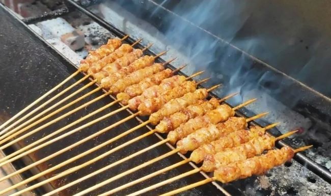 店內的五花肉串是經典爆款。不同于常規的肥瘦相間切片,這里的五花肉被巧妙地切成塊狀,瘦肉與肥肉相間搭配,呈現出誘人的色澤。剛出爐的五花肉晶瑩剔透,青陽人喜歡趁熱將還在“滋滋”作響的五花肉從竹簽上擼下來,放在一片鮮嫩的生菜上包裹著吃。烤好的五花肉外脆里嫩,香氣四溢,咬上一口滿嘴爆油,配上生菜正好解膩。喜歡吃蒜的人,還可以放上一瓣蒜,一場味蕾的盛宴就在口腔內開啟。