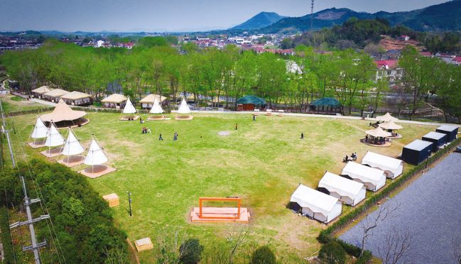“ 我們這里占地51畝,你們抬頭看,不遠處就是九華山的筆架峰。”尹強強介紹,營地草坪上設有多種主題帳篷、不同規(guī)格天幕,還有自搭建營位和房車營位,能同時容納200人露營團建。