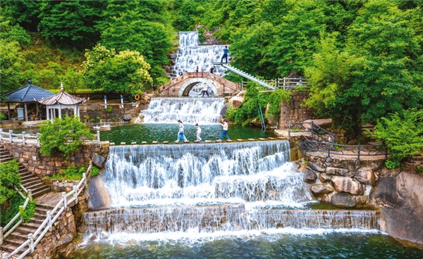 青陽縣蓮峰云海景區憑借叢林幽谷、流泉飛瀑的特色景觀,成為夏季游客打卡的熱門景區。圖為6月8日,游客在蓮峰云海景區瀑布群游玩,樂享周末時光。