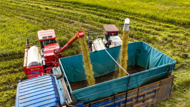 在青陽縣木鎮鎮,三臺收割機正開足馬力,在田間往返穿梭。現場,馬達聲、收割聲與稻谷流動的聲音交織在一起,呈現出一派緊張的搶收景象。該鎮種糧大戶徐家富告訴記者:“我今年承包了800多畝水稻,天氣預報說過兩天有雨,我請了三臺收割機,在下雨之前,爭分奪秒地要把稻谷收回去,防止倒伏、發霉、發芽,確保顆粒歸倉。”