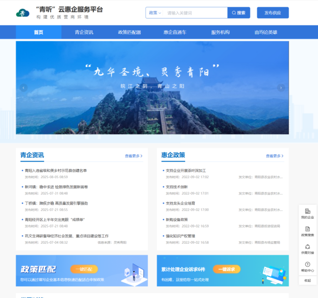 “不用自己找政策,平臺會主動推過來,就像有了專屬‘管家’。”提及“青聽”云惠企服務平臺,廣宇電子辦公室主任錢萍贊不絕口。為解決企業“找政策難、享政策繁”的問題,青陽縣在“三個一”模式中專門打造“青聽”云惠企服務平臺,集成政策推送、訴求辦理、融資對接等功能,讓惠企服務從“企業找政策”變成“政策找企業”。