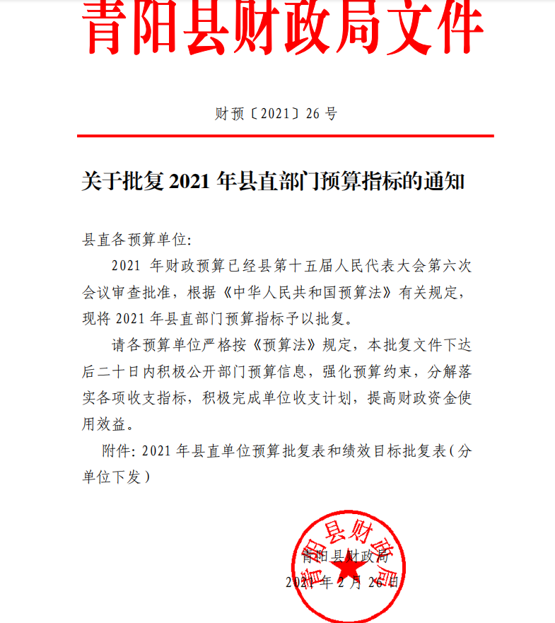 名稱: 青陽縣民政局2021年預算指標批復公示 文號: