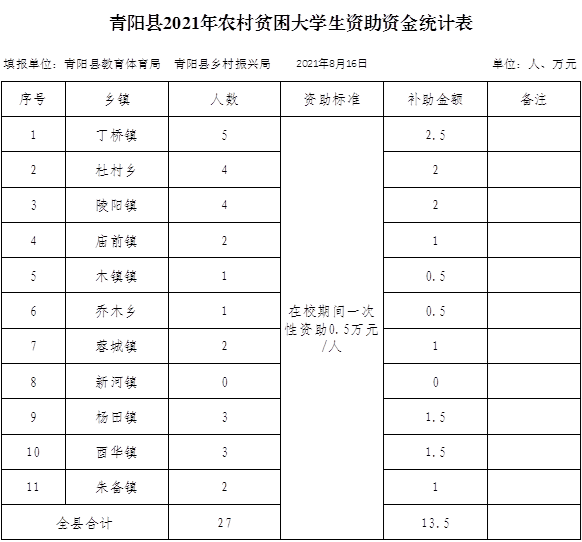 青陽縣2021年農村貧困大學生資助資金發放公告