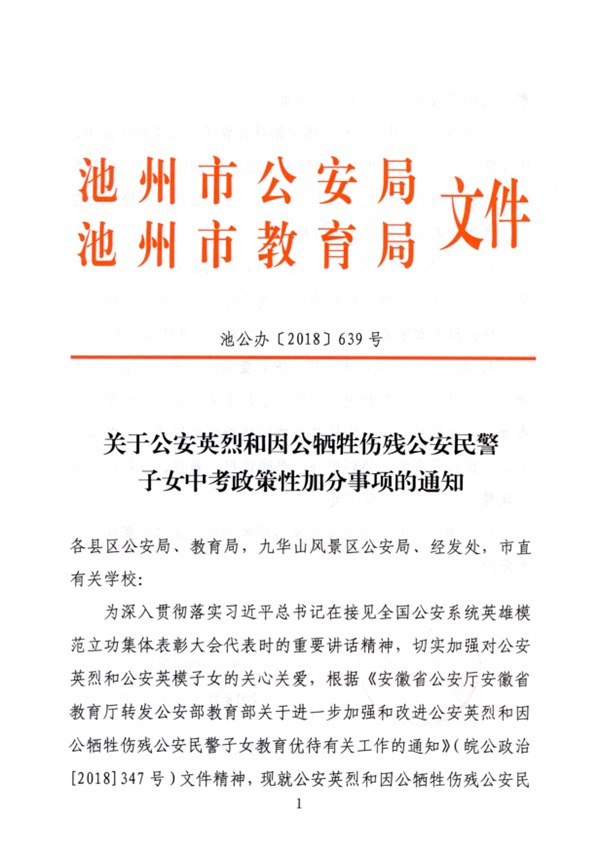 名稱: 關于公安英烈和因公犧牲傷殘公安民警子女中考政策性加分事項的通知 文號:
