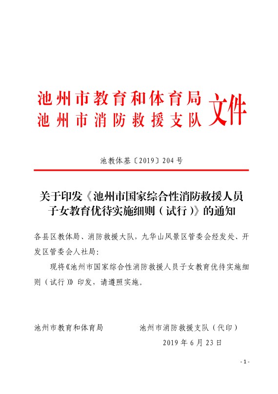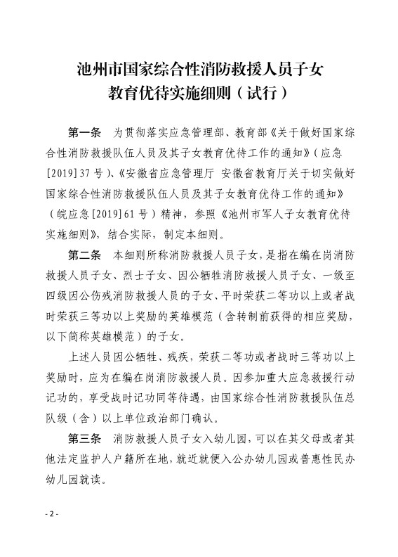 名稱: 關于印發《池州市國家綜合性消防救援人員子女優待實施細則(試行)》的通知 文號: