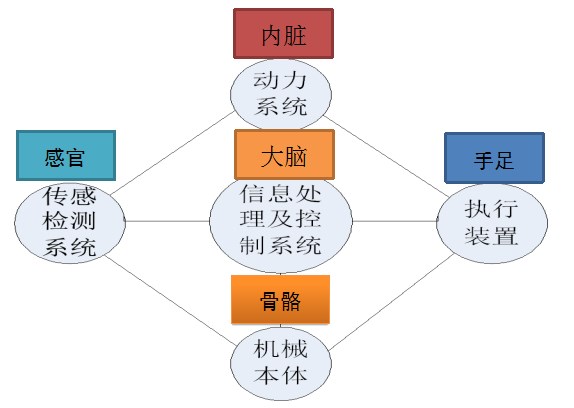 三、機電一體化系統的組成。一個較完善的機電一體系統一般包括以下五大基本要素:機械本體、動力系統傳感檢測單元、執行裝置、傳感與檢測系統及信息處理及控制系統。其與人體五大要素對應關系如下: