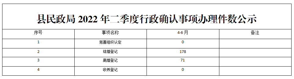 縣民政局2022年二季度行政確認(rèn)事項(xiàng)辦理件數(shù)公示