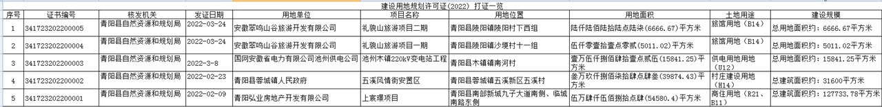 青陽縣自然資源和規(guī)劃局2022年第一季度建設(shè)用地規(guī)劃許可證核發(fā)一覽