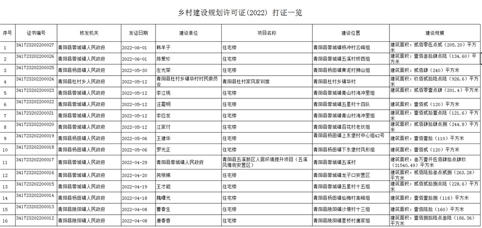 青陽縣自然資源和規劃局2022年第二季度鄉村規劃許可證核發一覽