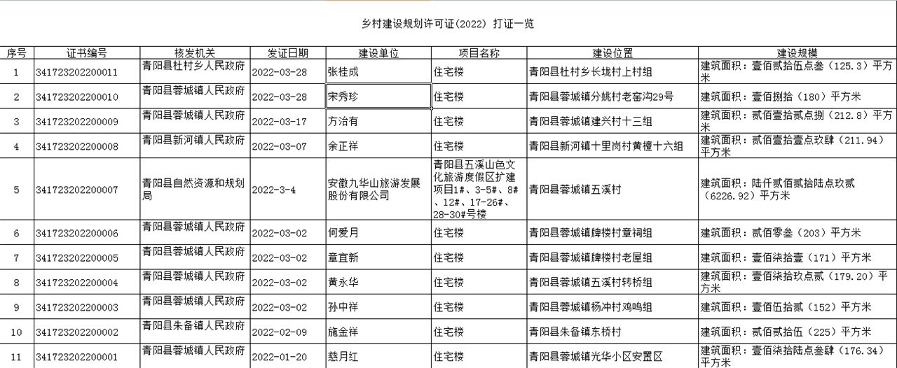 青陽縣自然資源和規(guī)劃局2022年第一季度鄉(xiāng)村規(guī)劃許可證核發(fā)一覽
