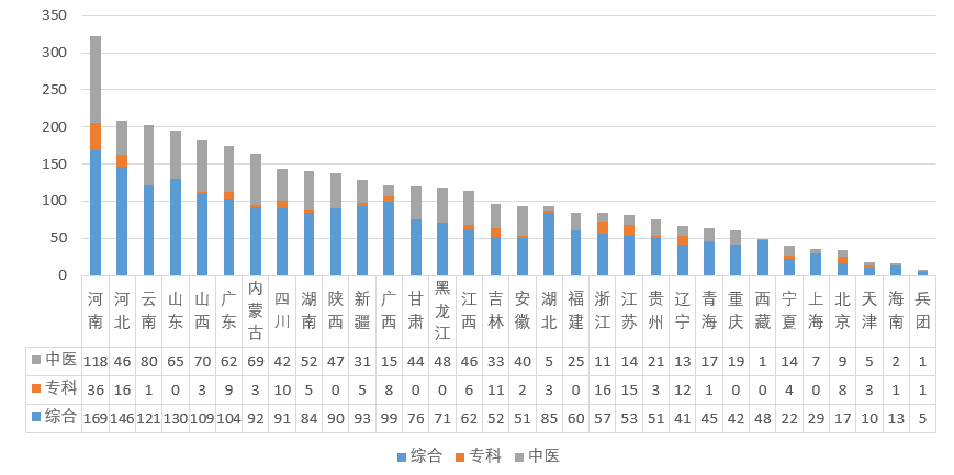 經各省級衛生健康行政部門和中醫藥主管部門審核確認,全國共3472家二級公立醫院參加2020年度績效考核,約占當年全國二級公立醫院總數的64%。其中,西醫類醫院2400家(綜合醫院2221家,專科醫院179家),約占當年全國西醫類二級公立醫院總數的65%;中醫類醫院1072家,約占當年全國中醫類二級公立醫院總數的60%(見圖1)。與2019年相比,參加考核的醫院數量增加398家,其中新增470家,主要集中在四川、河北、西藏等省份,因合并、升級、撤銷等原因退出考核72家。