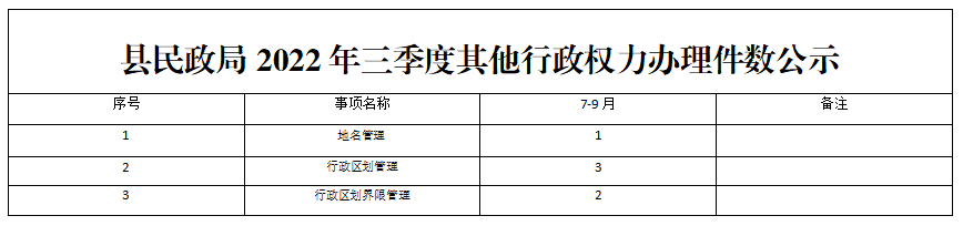 名稱: 縣民政局2022年三季度其他行政權力辦理件數公示 文號: