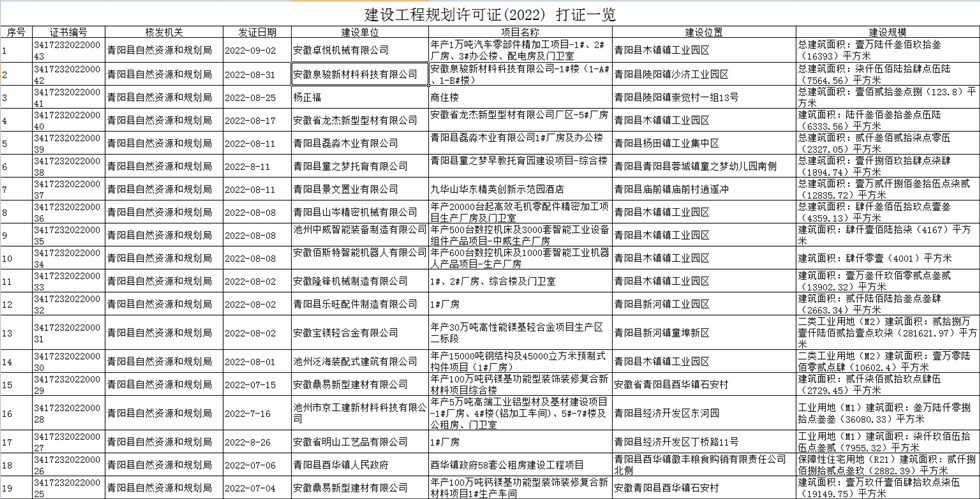 青陽縣自然資源和規劃局2022年第三季度建設工程規劃許可證核發一覽