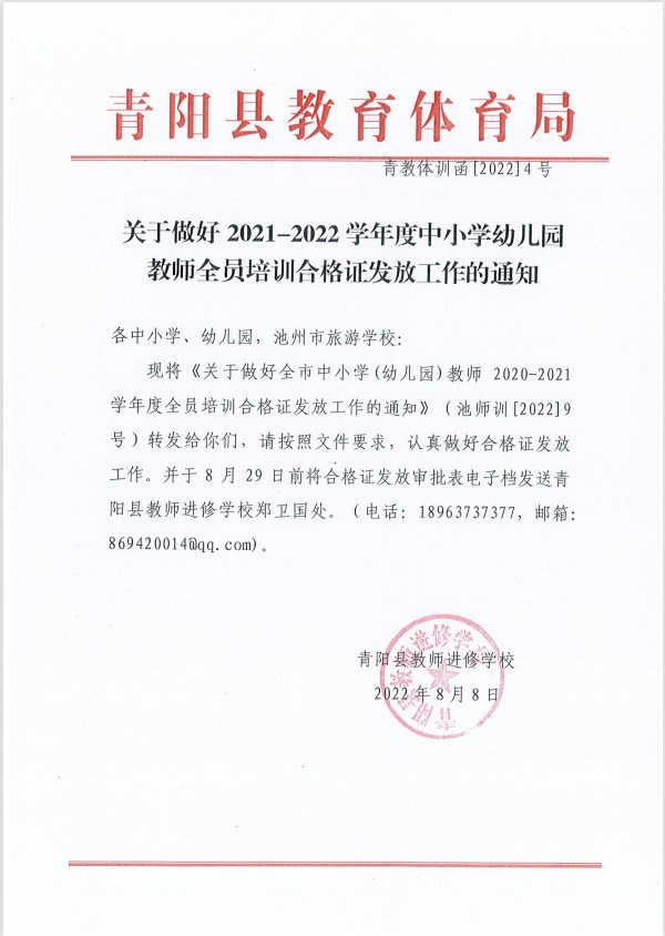 名稱: 關于做好中小學(幼兒園)教師2021- 2022學年度全員培訓合格證發(fā)放工作的通知 文號: