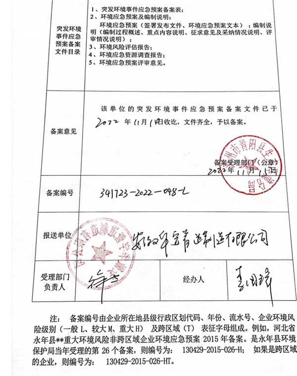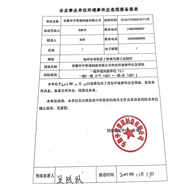 池州市青陽縣生態環境分局關于安徽華宇管道制造有限公司的應急預案備案表