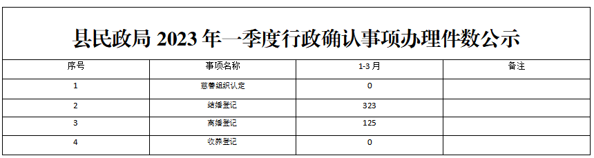 名稱: 縣民政局2023年一季度行政確認事項辦理件數公示 文號: