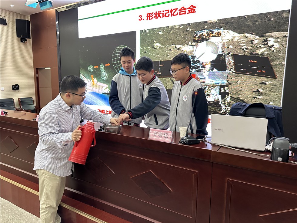 楊康教授巧妙地借助一些模型道具,為同學們帶來了一場生動形象、淺顯易懂的《航天中的新材料》專題科普報告,同學們也積極參與討論、互動,就空間站、火箭、衛星、探測器發表自己的觀點,并親身參與記憶合金的科學小實驗中。