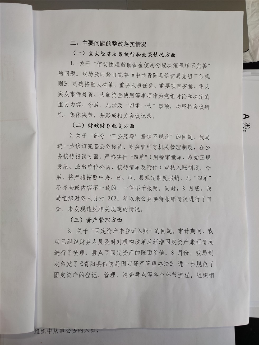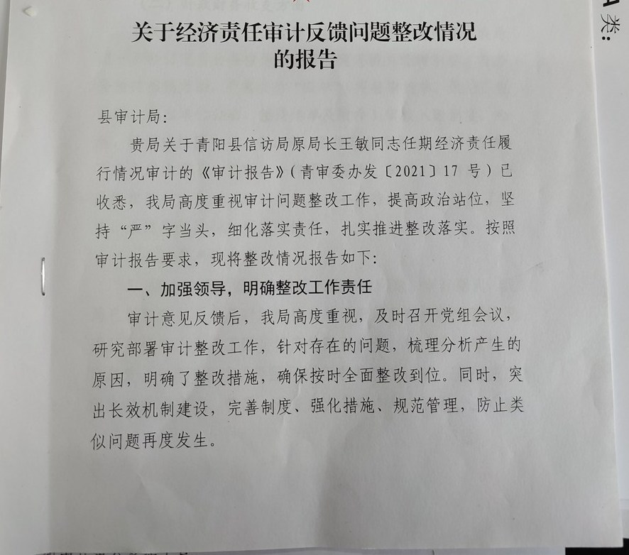 名稱: 縣信訪局原主要負責人任期經濟責任審計整改情況報告 文號: