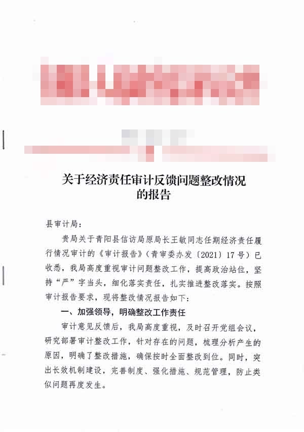 您現在所在的位置: 網站首頁 > 政府信息公開 > 青陽縣人民政府辦公室 > 審計公開 > 審計整改情況