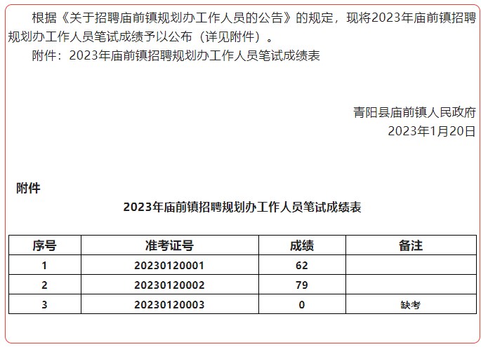 名稱: 廟前鎮招聘規劃辦工作人員筆試成績公告 文號: