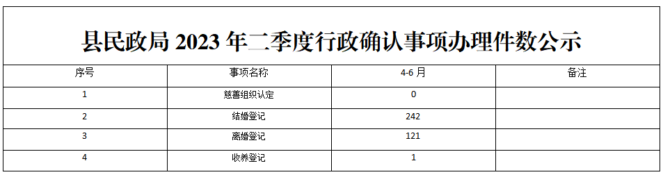 縣民政局2023年二季度行政確認事項辦理件數公示