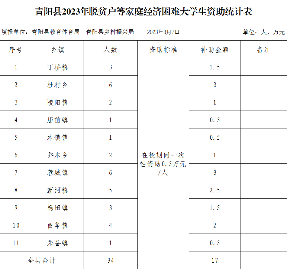 現將擬發放2023年家庭經濟困難大學生資助資金17萬元(分鄉鎮統計表附后)予以公告。
