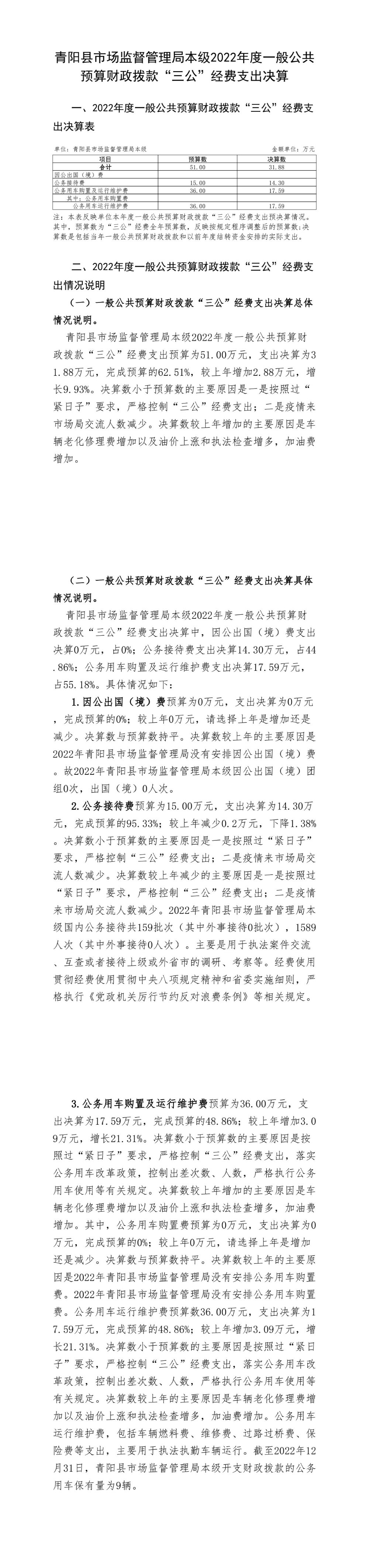 名稱: 青陽縣市場監督管理局本級2022年度一般公共預算財政撥款“三公”經費支出決算公開情況 文號: