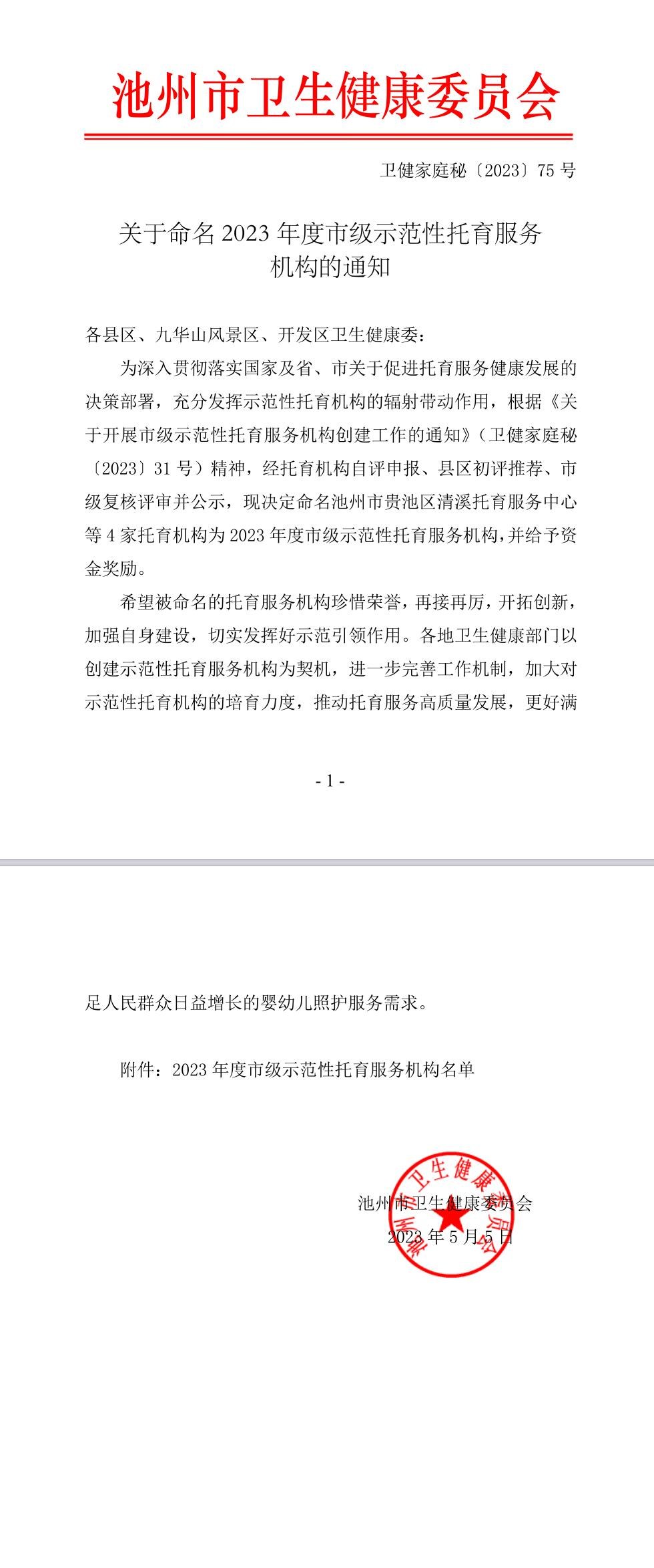 關于命名2023年度市級示范性托育服務機構的通知(正式公文)