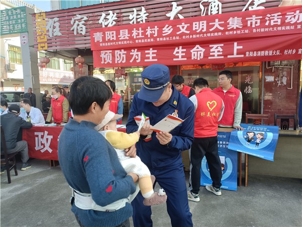 11月8日上午,青陽縣杜村鄉組織應急辦、派出所、新時代文明實踐所、社工站等部門,并邀請青陽縣消防大隊廟前工作站在杜村集鎮人流聚集處開展現場宣傳,設置消防安全宣講臺,志愿者首先為大家講解生活中的安全用電、安全用氣、安全避災等安全知識進行廣泛宣傳,發放消防安全知識冊子600余份,耐心解答群眾有關消防疑問15次。
