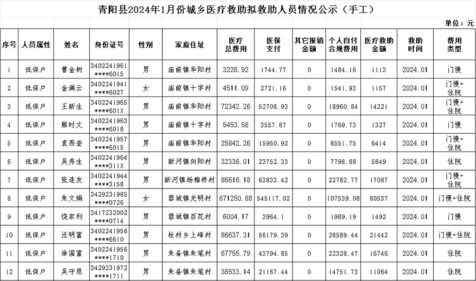 關(guān)于青陽(yáng)縣2024年1月份城鄉(xiāng)醫(yī)療救助擬救助人員情況公示
