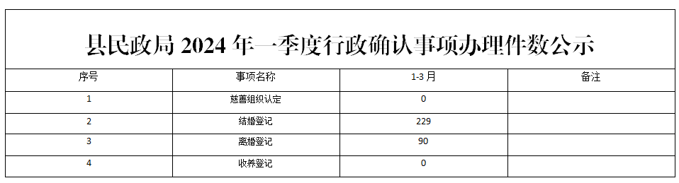 縣民政局2024年一季度行政確認事項辦理件數公示