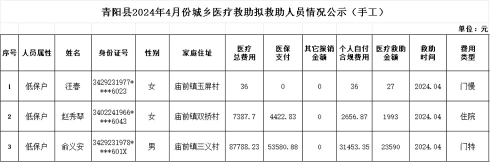 附:青陽縣2024年4月份城鄉醫療救助擬救助人員情況公示