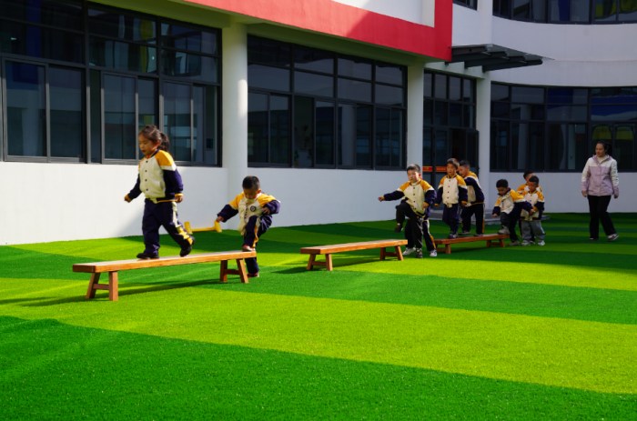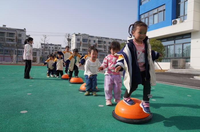 “和暖的陽光照耀著我們,每個人臉上都笑開顏……”3月19日下午放學后,縣第五幼兒園課后延時服務拉開序幕,清脆的童音朗誦伴著樂曲飄出教室外。在戶外場地上,小朋友們排隊投擲沙包、玩滑梯;在老師的帶領下,隨著彩虹傘一起一落,往返跑動,各類歡樂游戲讓他們臉上始終掛著燦爛的笑容。