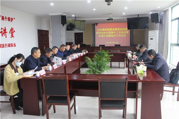 3月14日上午,青陽縣召開縣委依法治縣辦第十二次會議暨協調小組副組長工作會議,縣委常委、政法委書記、依法治縣辦主任、縣公安局局長盧玉主持會議并講話。縣委全面依法治縣辦全體成員出席會議,費飛副縣長、縣委依法治縣委各協調小組副組長參加會議。