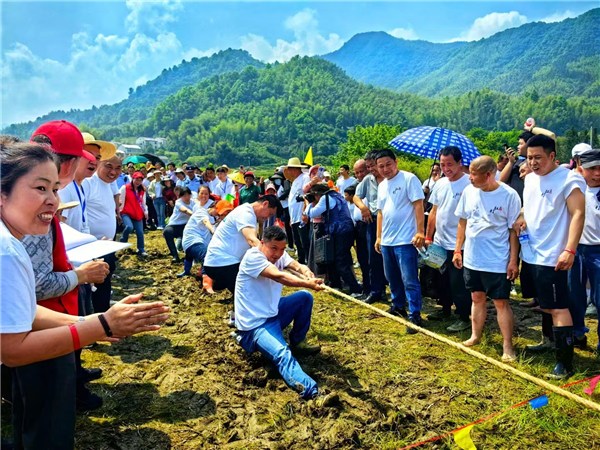 農耕體驗活動作為本次的重頭戲,包含了插秧、拔河、摸魚等多個競技活動。插秧比賽中,選手們緊張有序地進行插秧,只見大家卷袖赤腳、埋頭彎腰,左手緊握秧苗,右手敏捷地分苗、插秧,不一會兒,田野中便布滿了生機勃勃的綠色。渾濁的泥塘里,參加摸魚比賽的選手們熱情高漲,赤腳上陣,穿梭于水田間,埋下身子仔細尋找魚兒的蹤跡,親密享受著與田園接觸的時光,縱然泥水濺滿了全身,但他們仍然興致不減,忙得不亦樂乎。拔河比賽更是將活動的氛圍推向高潮,游客們站在田坎上,加油聲、歡笑聲此起彼伏,一眼望去,滿是活力。