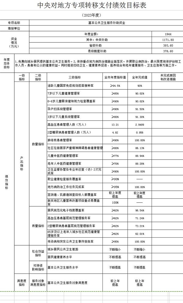 2023年我縣繼續按照上級要求,認真組織實施城鄉居民健康檔案管理、健康教育管理、預防接種管理、0-6歲兒童健康管理、孕產婦健康管理、老年人健康管理、高血壓患者健康管理、2型糖尿病健康管理、嚴重精神障礙患者管理、肺結核患者管理、傳染病及突發公共衛生事件管理、中醫藥健康管理、衛生計生監督協管服務管理項目和國家基本藥物制度補助項目。各項目均依照方案要求分類管理,項目各項指標全面完成,項目產出總體優良,達到預期效果。