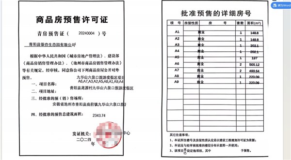 名稱: 九華山六泉口旅游度假區項目A6,A7,A3,A2,A5,A8,A1,A9,A4預售許可證 文號: